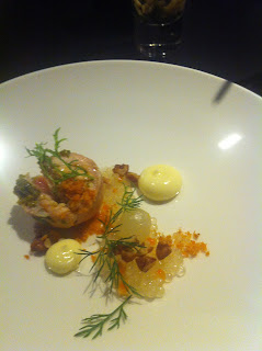 Second course was smoked kibbeh neya, yohurt wasabi foam, soy pearls, mint, cucumber, rice cracker. When I read the menu i had no idea what kebbeh neya was turns out it is raw tuna.This was very nice but the wasabi foam was really strong for me